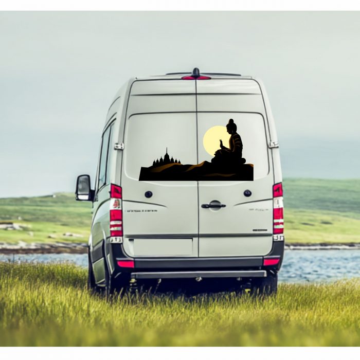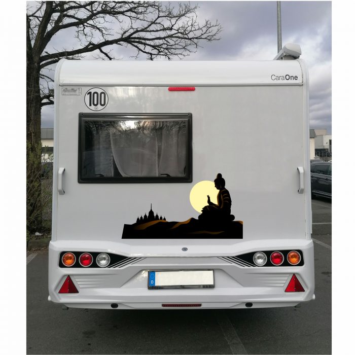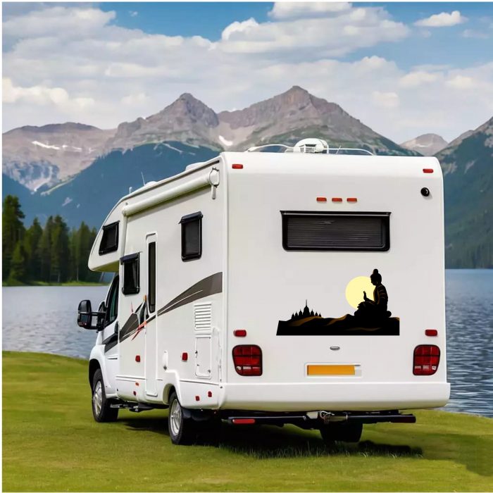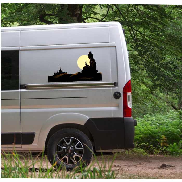 Buddha Aufkleber betend als Farbiger Digitaldruck auf deinem Wohnmobil spirituelles exklusiv Design.