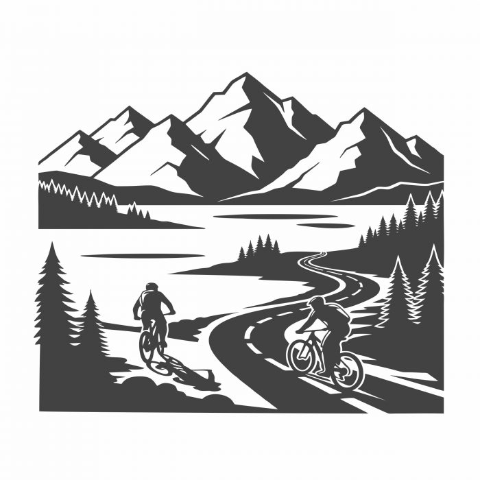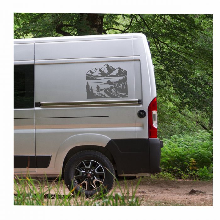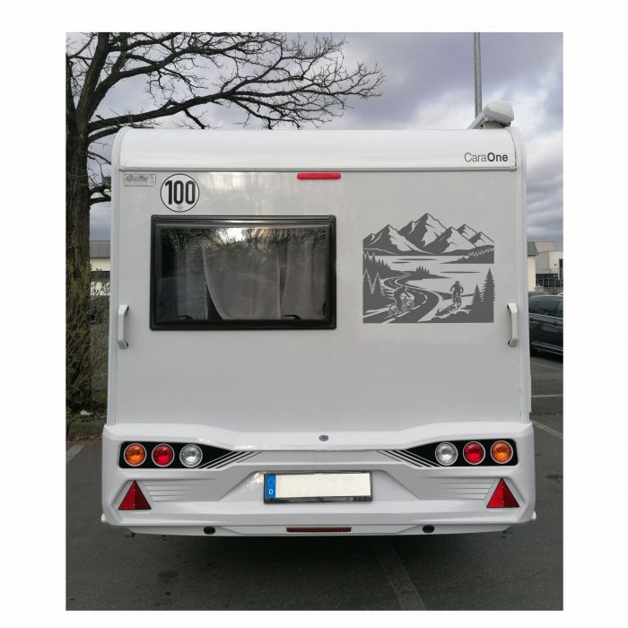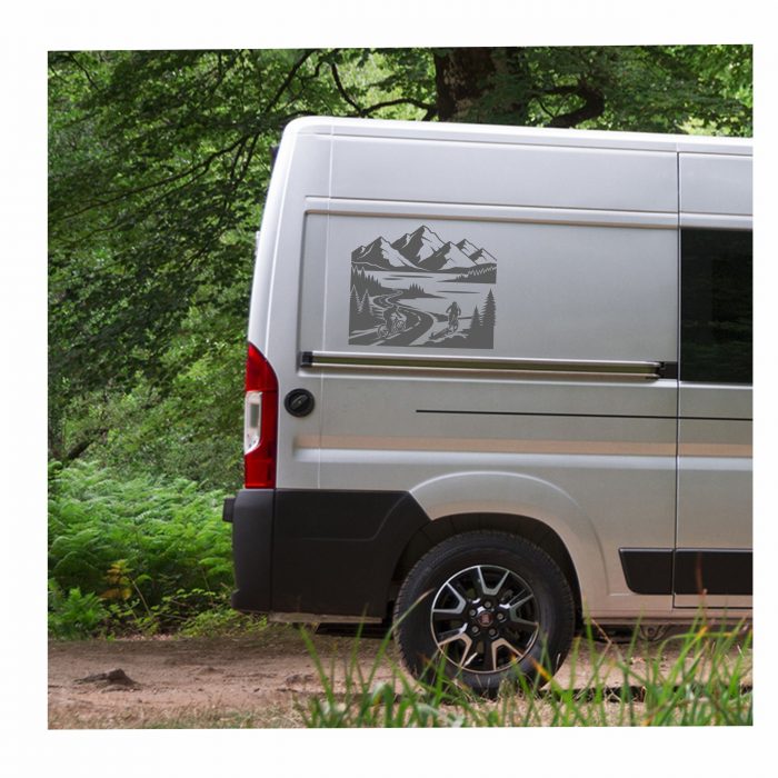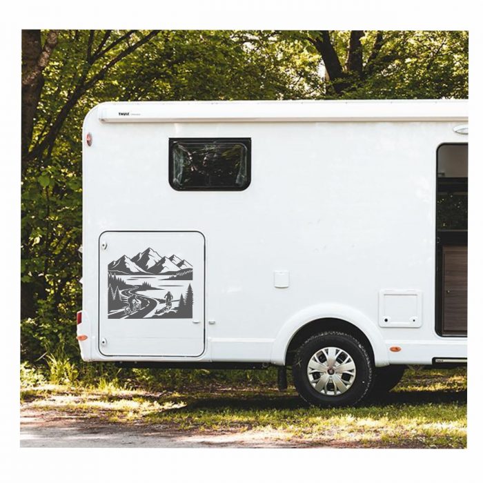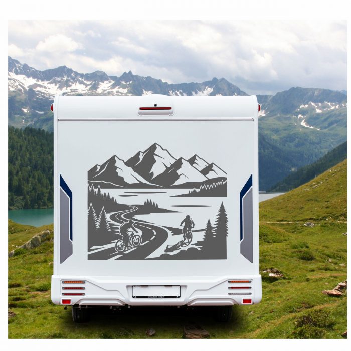 Mountainbiker Berge mit See und Straße Aufkleber für dein Reisemobil oder Wohnmobil