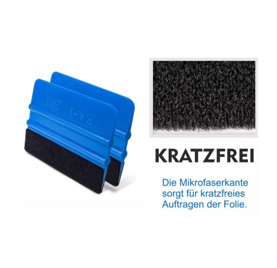 – Auch auf empfindlichen Untergründen sorgt die Mikrofaserkante für kratzfreies Auftragen von Folie. Wir empfehlen das befeuchten vom Mikrofaser mit einer Spülmittellösung um perfekte Gleiteigenschaften zu ermöglichen.