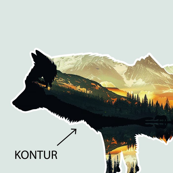 Dieser eindrucksvolle Sticker zeigt die kraftvolle Silhouette eines Wolfes, in deren Innerem sich eine stimmungsvolle Landschaft entfaltet. Das Motiv vereint Naturverbundenheit, Stärke und Abenteuerlust in einem besonderen Design. Die klare Kontur sorgt für eine moderne, hochwertige Optik und lässt das Motiv intensiv zur Geltung kommen.