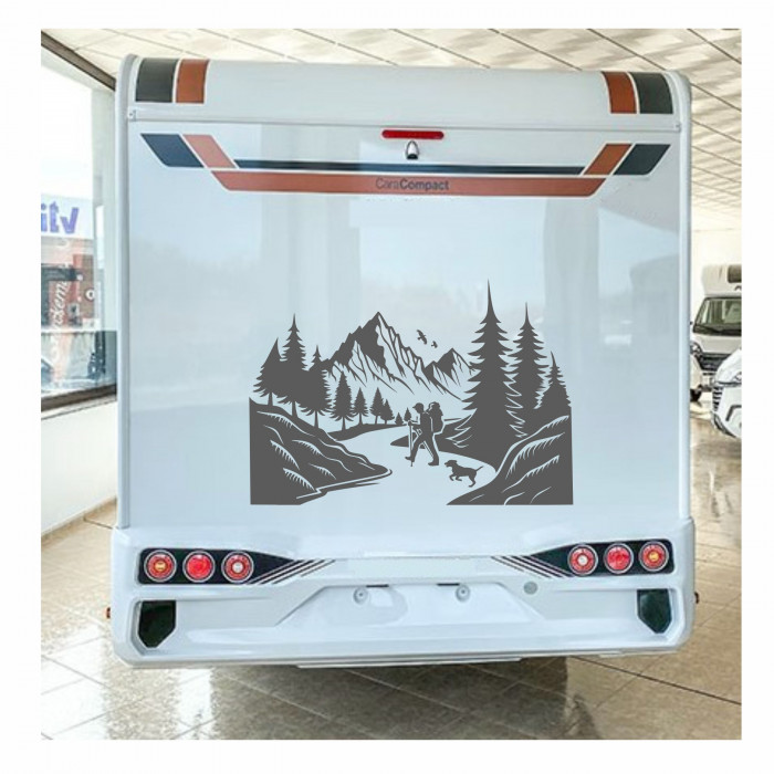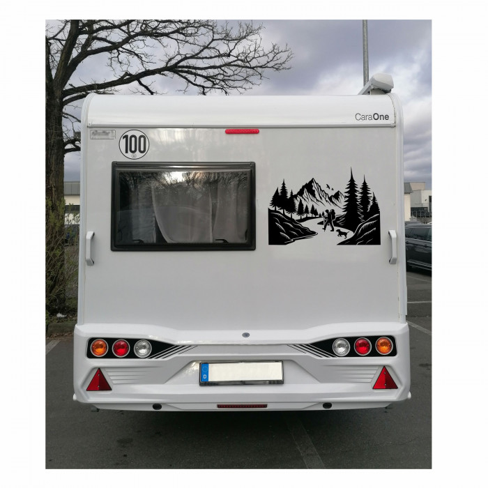 Aufkleber Wohnmobil Wanderer mit Hund in den Bergen.