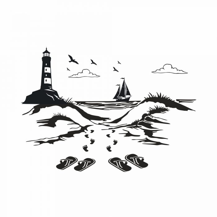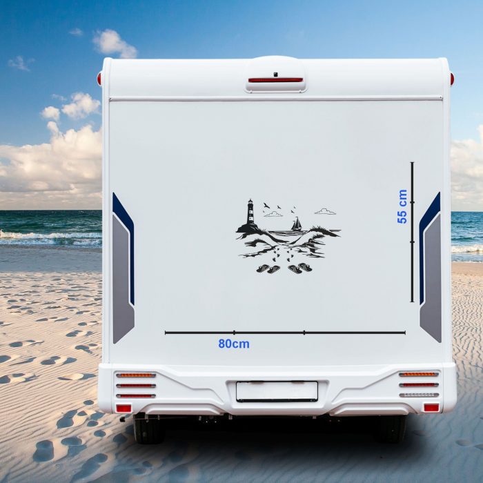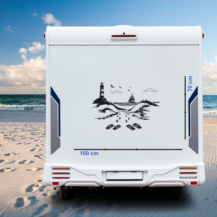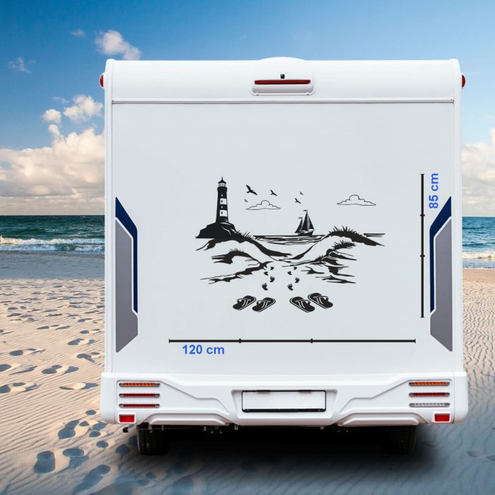 Leuchtturm, Schiff und Strand der Aufkleber für dein Reisemobil, Wohnmobil oder Transporter, Exklusiv Design was ausfällt.