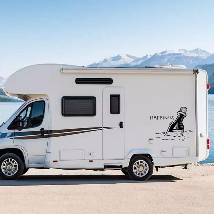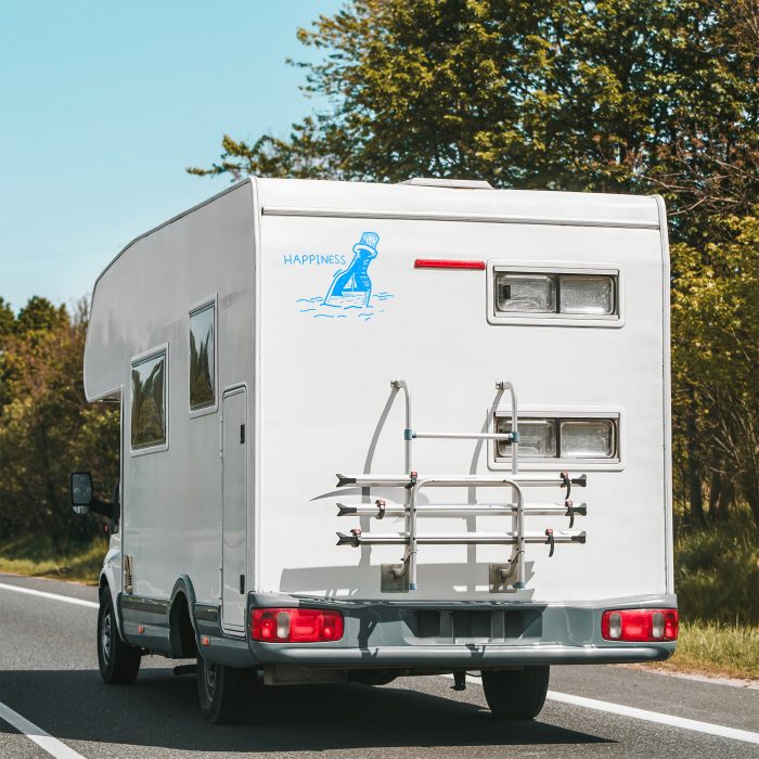 Dieser Wohnwagen-Aufkleber zeigt eine liebevoll gestaltete Flaschenpost, die im Wasser treibt. In der Flasche ist ein kleines Boot zu sehen, während daneben der Schriftzug „Happiness“ steht – ein Symbol für Freiheit, Abenteuer und das Glück des Reisens. Das maritime Motiv bringt Urlaubsstimmung und Fernweh auf dein Fahrzeug.
